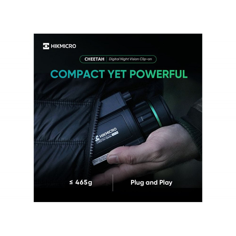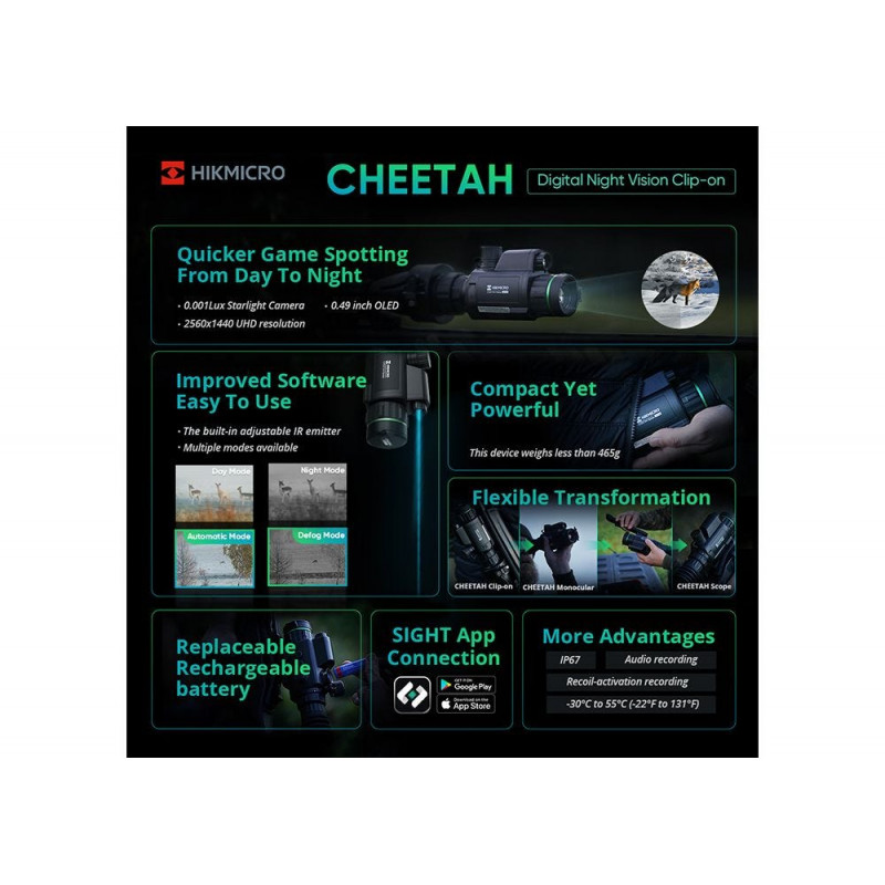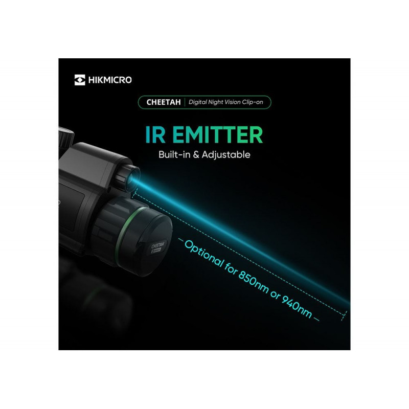The HikMicro Cheetah Clip-On 940 nm IR night vision scope has a rechargeable battery and thanks to the USB-C port, an external power source can be used too. It can also record image (photo and video) and sound, using an internal 64 GB memory. Even recoil activation is supported, starting a recording when the rifle is fired.