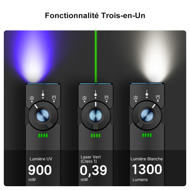 Versatile 3-in-1 EDC: Olight's FIRST rechargeable flashlight that combines 1,300lm white light, 900mW UV light, and Class 3R green laser, offering versatility for a wide range of applications.