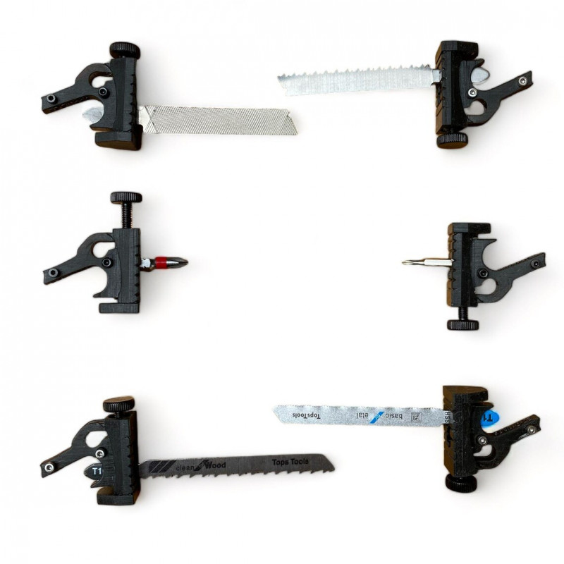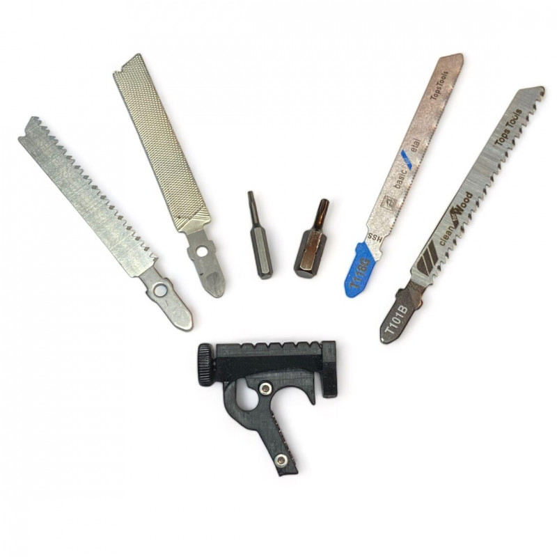 The unique feature of this new mod is its integration of an ingenious quick-release system for standard T-SHANK blades without the need for tools! It only takes a few seconds to fit any commercially available T-SHANK blade, and with a small adjustment, you can insert the Leatherman Surge's replacement saw and file.