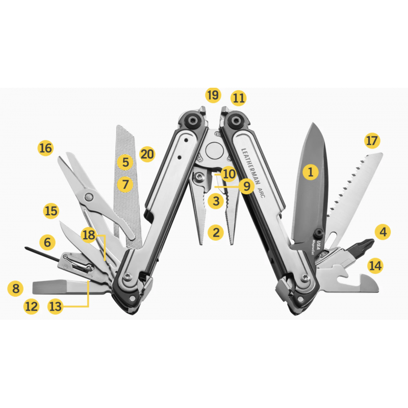 ARC is the first-ever multi-tool to include premium MagnaCut steel. The knife blade is made of CPM MagnaCut steel which maintains a sharp edge and excels in corrosion resistance, toughness, and ease of sharpening. The result is a knife blade that's perfect for everyday tasks as well as the harshest of environments. The DLC coating on the blade adds another layer of corrosion resistance. ARC also includes the highly-requested bit driver and thanks to FREE technology, each feature opens smoothly and is 100% one-hand operable. With 20 tools, removable pocket clip, four-pocket nylon sheath, and nine double-ended bits, the durable, practical ARC sets the standard for now and the future for premium multi-tools.