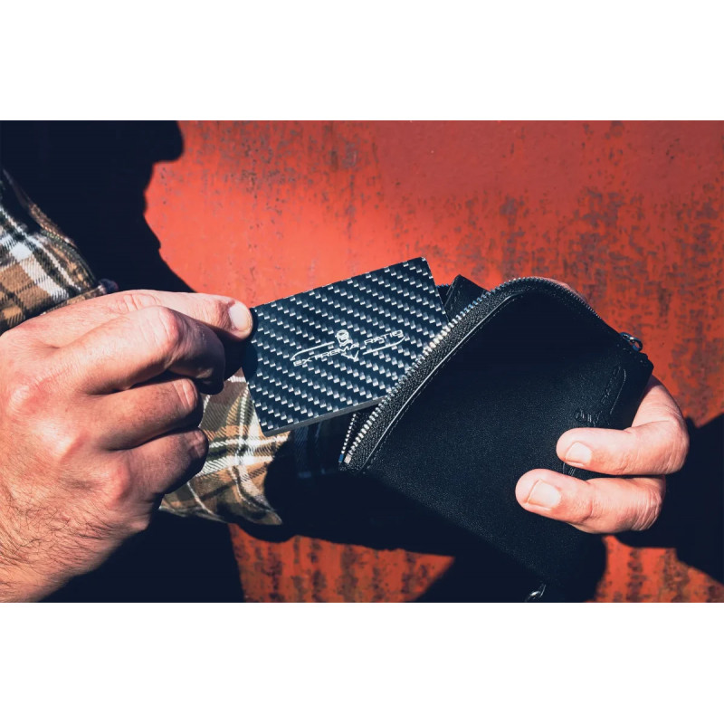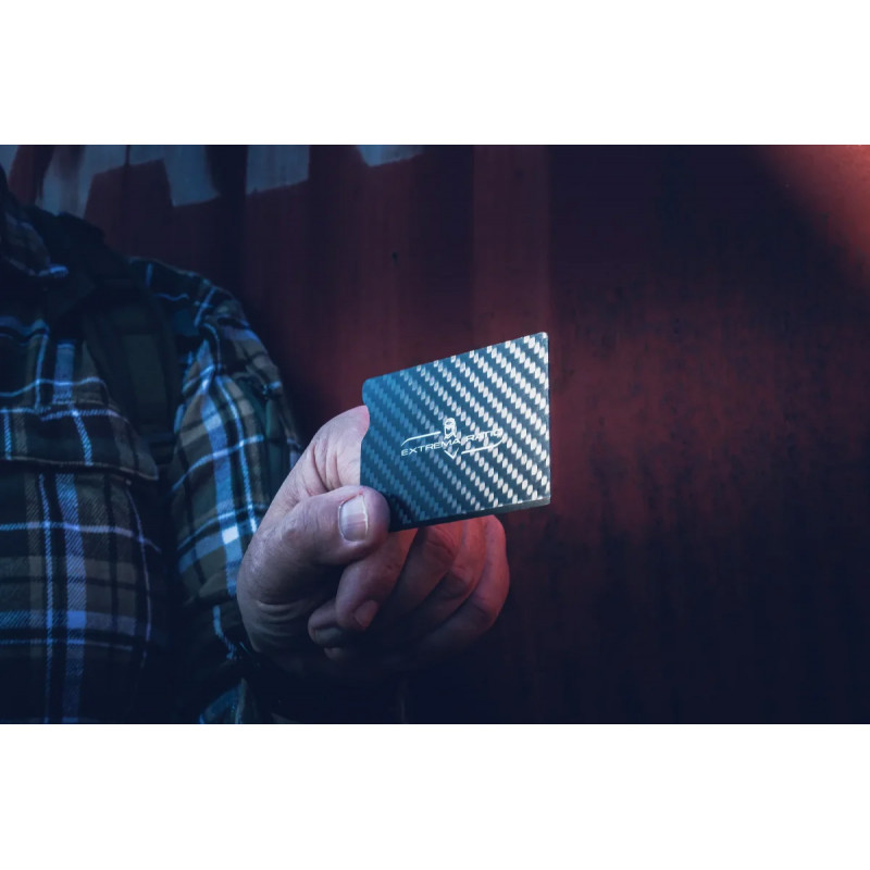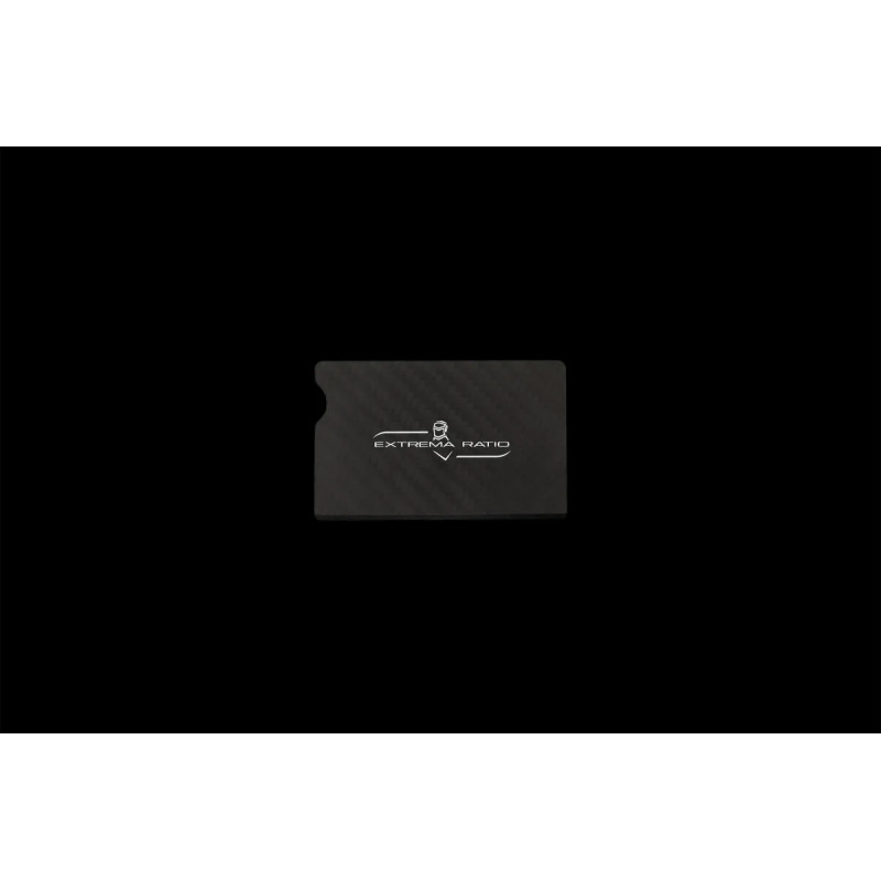 Made of carbon fiber. The lower edge is sharpened, making this EDC tool a potential resource in personal safety situations. It has the dimensions of a standard credit card and fits perfectly inside the Extrema Ratio wallet.