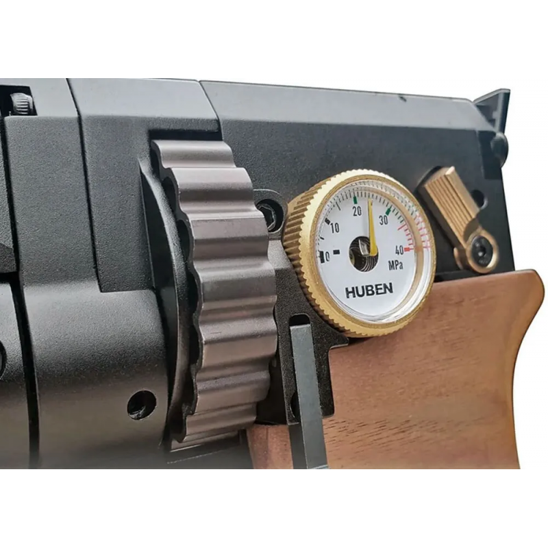 At the heart of the Huben GK1 Mini lies a 152 mm barrel and an 49 cc PCP-cylinder. Monitoring air pressure is effortless with the integrated gauge, promoting optimal performance. Refilling the cylinder is hassle-free using the provided fill adapter, conveniently located on the left side.