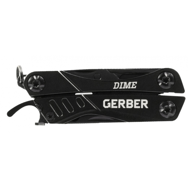 10-piece tool set: Pliers + Wire cutters + Knife blade + Can opener + Scissors + Flathead screwdriver + Phillips screwdriver + Bottle opener + Tweezers + File.