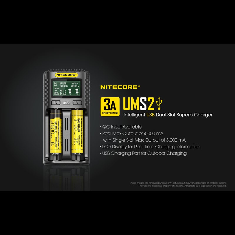 Ce chargeur USB intelligent à double emplacement NITECORE UMS2 est conçu pour recharger vos batteries rapidement, en toute sécurité et efficacement. L'UMS2 atteindra une sortie totale maximale de 4000mA lors de l'utilisation d'un adaptateur secteur USB de sortie 2A. Lorsque le chargeur est alimenté ou connecté à l'adaptateur d'alimentation à charge rapide (QC), l'écran affiche «Charge rapide» et le logement unique atteint une sortie maximale de 3000 mA.